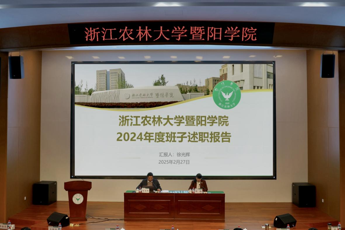 暨阳学院院长徐光辉代表学院领导班子作2024年述职报告。徐光辉从党建思政、人才培养、师资队伍、科研与社会合作、服务保障等方面回顾了学院一年来的工作成绩,并提出了学院2025年工作思路。
