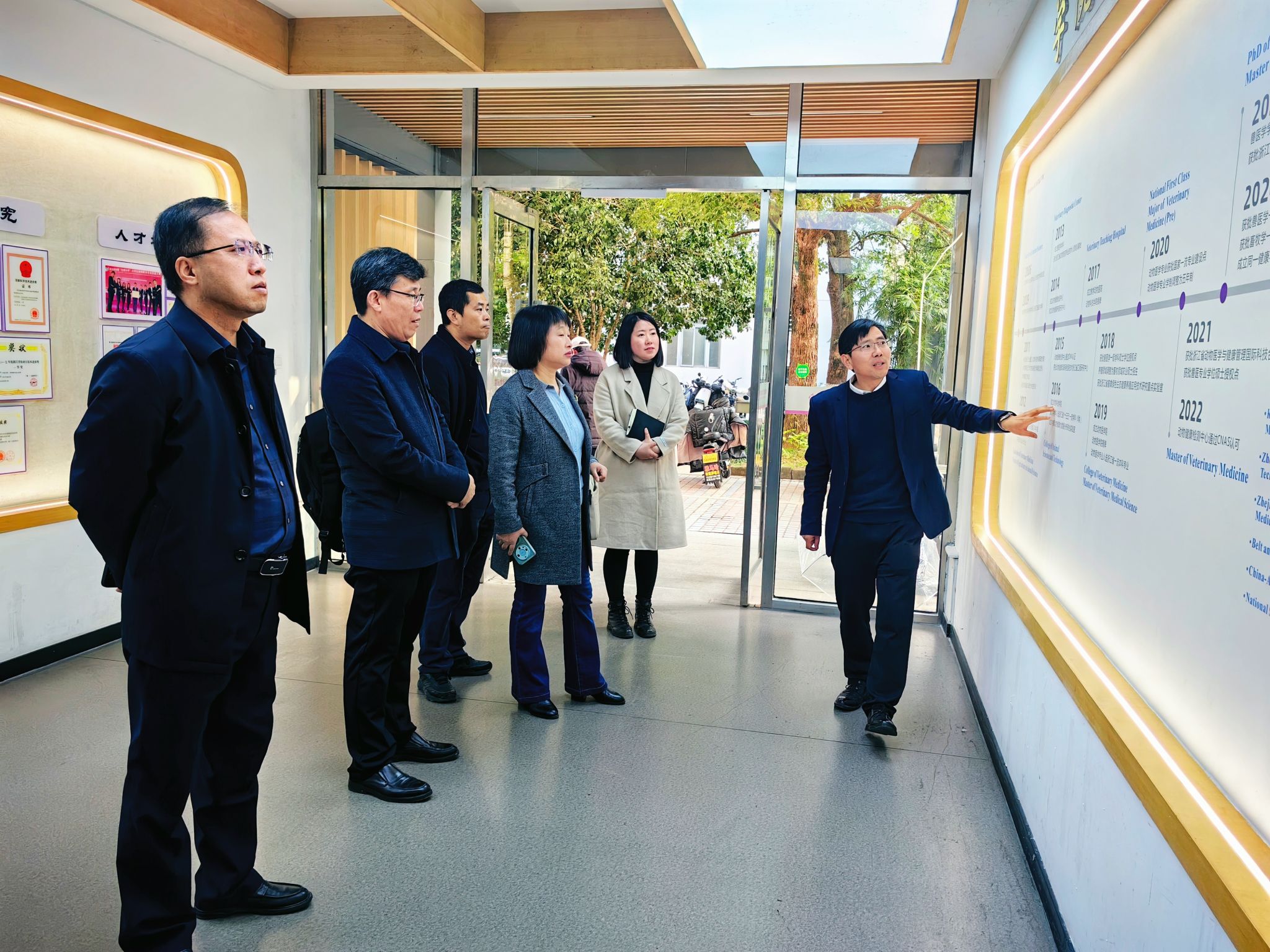 宋厚辉带领一行人参观了学院科研平台、教学动物医院、校友时光走廊、动物健康检测中心等场所,介绍了学院发展历程和办院理念,展示了人才培养、文化建设、社会服务等方面的成果,希望双方院校加强交流,在数字化教材建设、科研项目申报等方面加强合作。