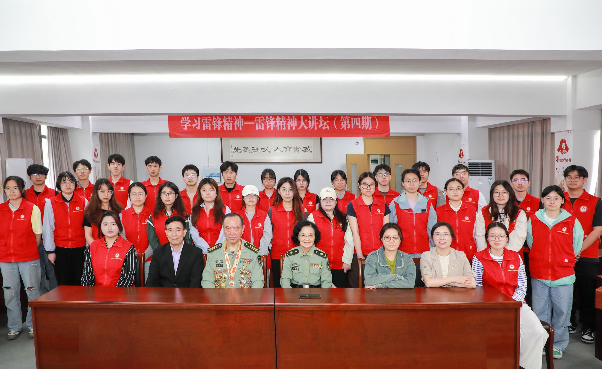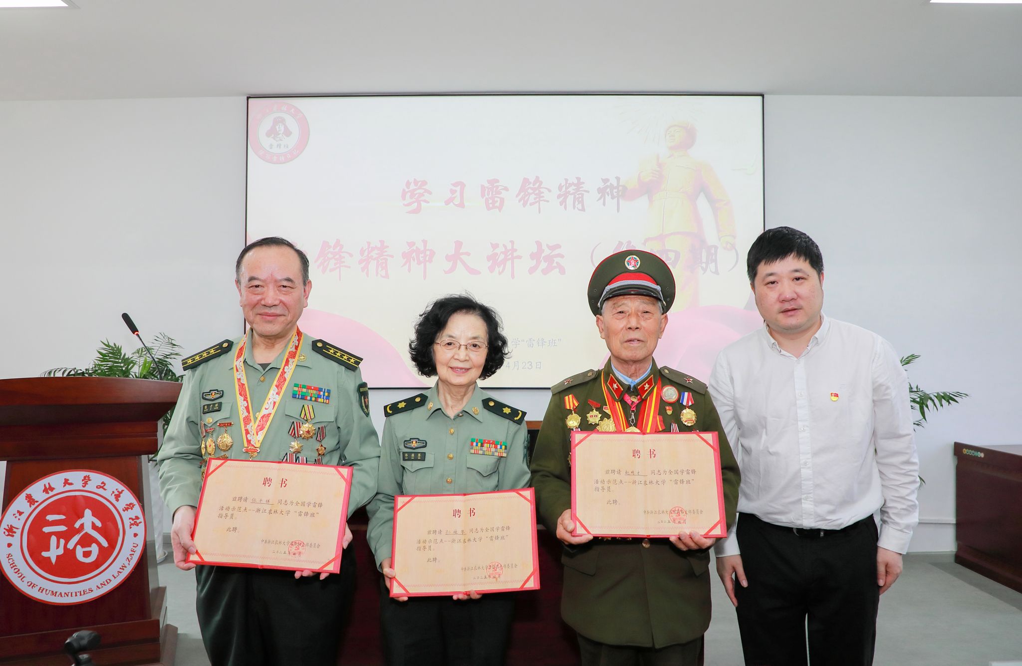 4月24日,雷锋班举办第四期雷锋精神大讲坛。应文法学院邀请,雷锋生前战友、全国学雷锋两会顾问赵明才,雷锋辅导过的学生、辽宁省雷锋干部学院客座教授孙桂琴,新时代活雷锋、最美学雷锋新闻人物张子祥,在杭州雷锋纪念馆馆长马水泉陪同下参加讲坛活动。活动由雷锋班班长耿徐婷主持。