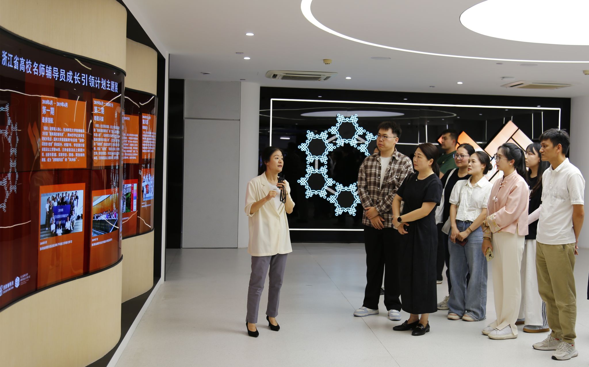 在数字化展厅内,辅导员们走进“导师群像”“教学实践”“成果示范”等主题展区,了解辅导员名师班发展历程,感悟123位名师班辅导员的成长案例,学习他们的育人故事,聆听导师的现场微课教学。大家在名师班学员画像的数据驾驶仓前驻足,在“百人墙”感受榜样的鲜活案例,在5D全息影像屏前留下自己的合影,在微课堂用明信片传递思政队伍的爱与温暖。虚实相融的展陈方式,让辅导员们真切感受到“数字技术+思政教育”的创新魅力。
