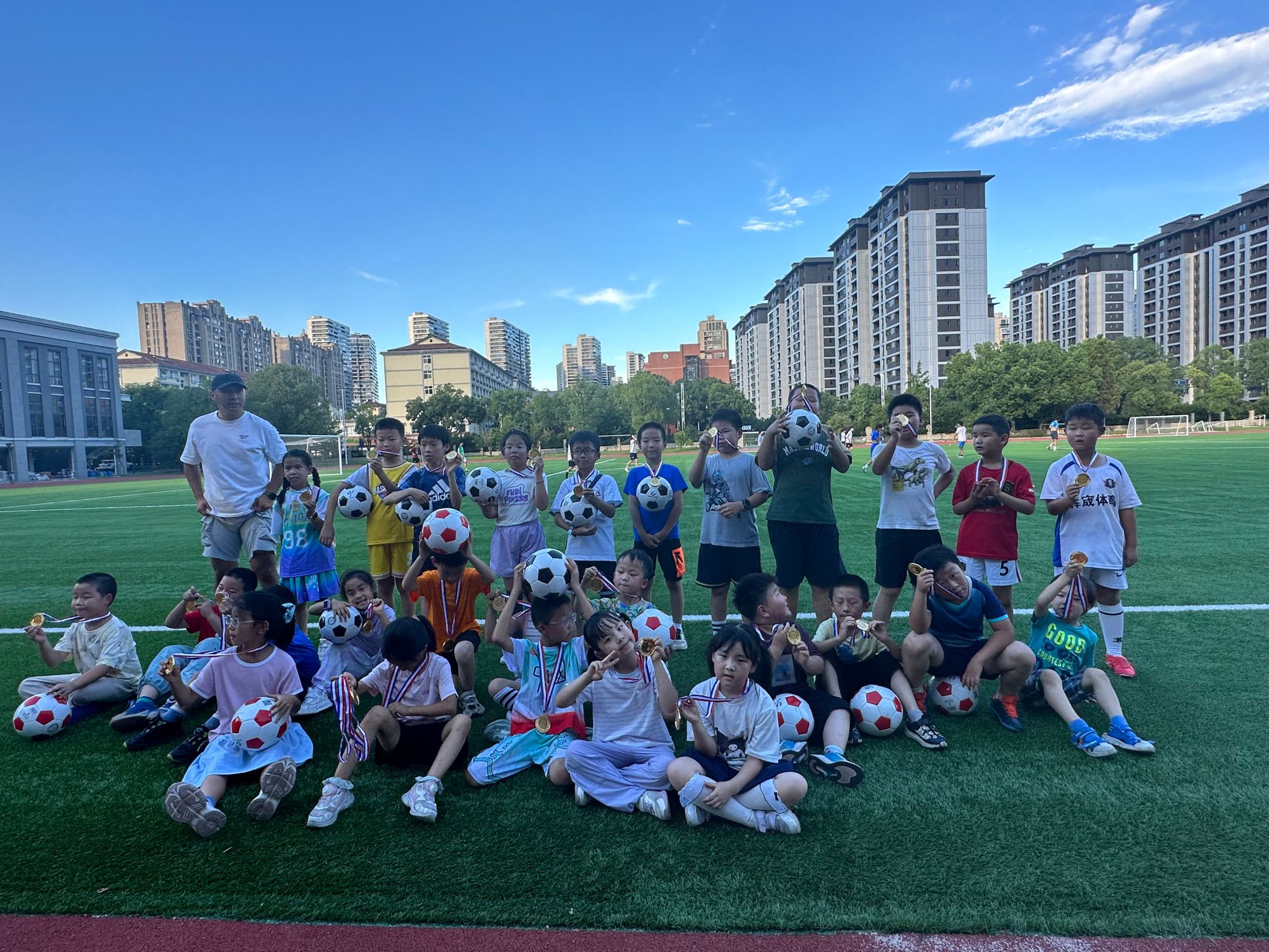 依托校园优质场地与专业师资,夏令营设置“绿茵驰骋”(足球)、“南拳北腿”(武术)、“活力无限”(体适能)、“绳彩飞扬”(花样跳绳)四大板块 。衣锦校区室内体育馆里,专业教练俯身指导,孩子们专注投入体适能雕琢、花样跳绳跃动、中华武术研习;户外绿茵场,足球小将们追风奔跑、切磋球技。从训练时的全神贯注,到收获奖牌的灿烂笑颜,成长与欢乐贯穿始终,夏日运动狂欢滋养身心,也让孩子们收获珍贵友谊。