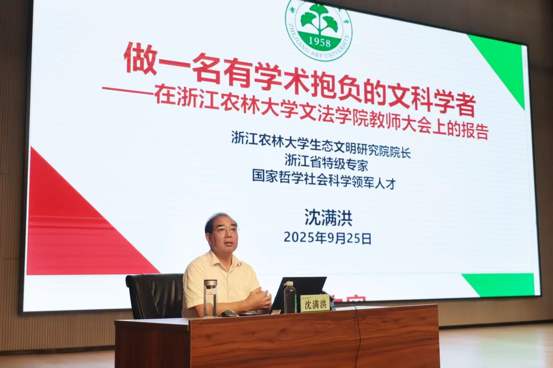 会议特邀学校原党委书记、开云电竞s13生态文明研究院院长沈满洪教授,面向全院教职工作《做一名有学术抱负的文科学者》辅导报告,他分享了自己在文科科研道路上攻坚克难的宝贵经验与体悟,激励文法教师在文科科研进步的道路上不断勇攀高峰。