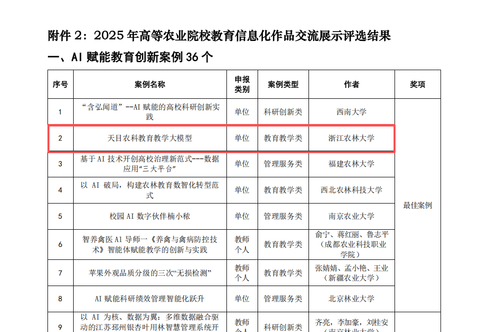 学校牵头研发的“天目农科教育教学大模型”荣获“AI赋能教育创新案例最佳案例”。该模型立足农林学科特色,探索人工智能与专业教育深度融合,在课程资源智能化建设、个性化学习推荐、虚拟仿真教学等方面展现创新价值,为涉农高校教育教学模式革新提供“浙农林大”方案。