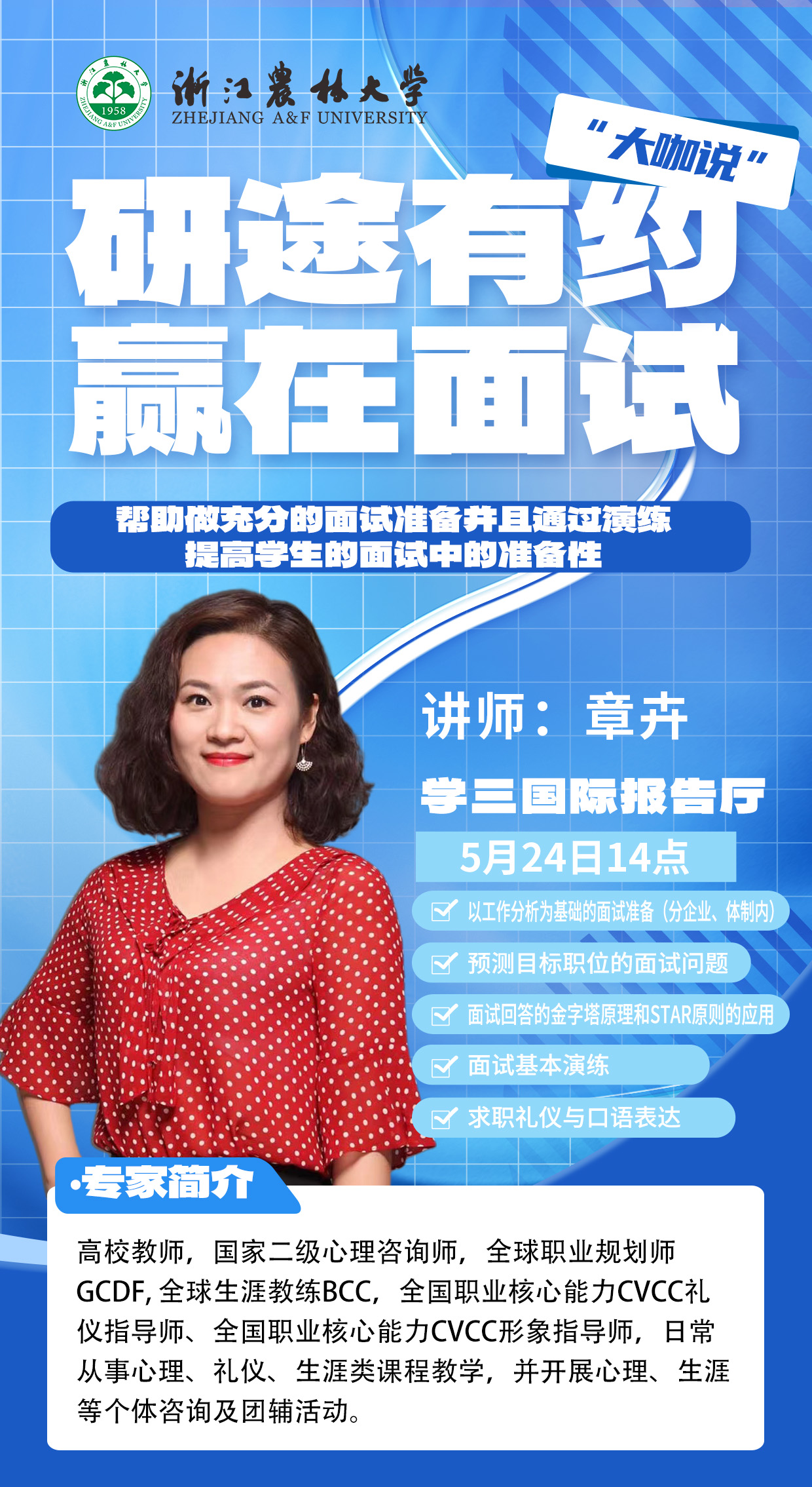 为进一步加强研究生就业指导工作,帮助研究生做好充分的面试准备,提高面试表现,提升就业竞争力,特举办第三场就业能力提升专场讲座,现将具体安排通知如下: