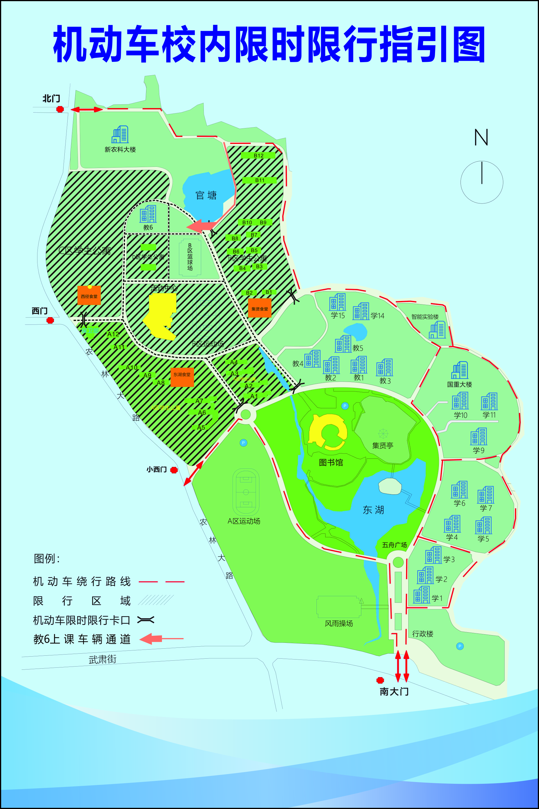 1.限行时间段内,机动车可经不限行区域道路从南门、小西门、北门等进出学校及到达目的地;尽量利用校内二环道路绕行。