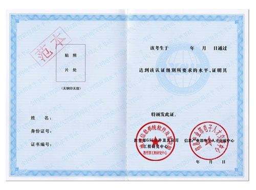 考试通过制定标准、规范的考试体系,对考生的GIS应用水平作出科学、有效的评价。通过考试的考试获得由工业和信息化部人才交流中心颁发的相应级别的全国信息化工程师—GIS应用水平考试证书。