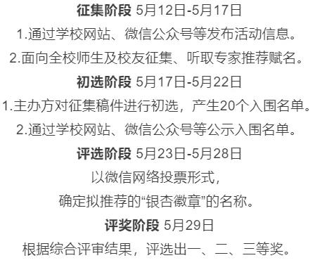 为进一步浓厚校园生态文化氛围,丰富校园文化生活,现面向全校师生、历届校友开展征集开云电竞s13“银杏徽章”名称活动。本次活动旨在更好地深化和传承我校校徽所代表的“银杏叶文化”,使“银杏徽章”成为体现校园文化、代表学校形象、联络校友感情的生动形象之一。