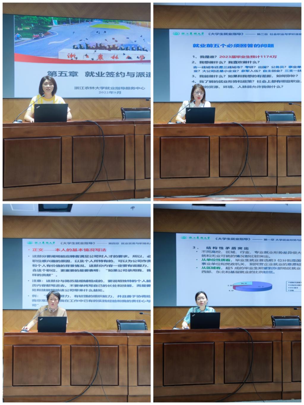卜京琼、谢婷婷、朱旻华、梅雨晴等四位老师对《大学生就业指导》的八个章节课程大纲进行详细解读,对于新的政策进行提醒和解释。