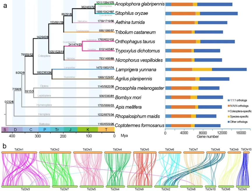 图2. a.双叉犀金龟与其他13种昆虫的基因家族及基因组进化分析; b.双叉犀金龟与赤拟谷盗染色体共线性分析.