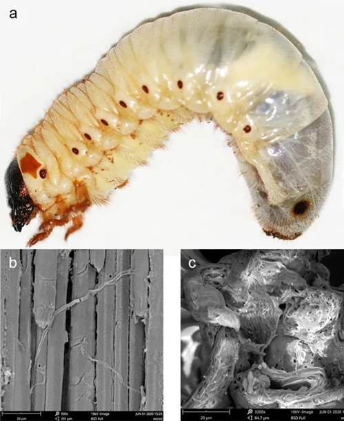 图1 双叉犀金龟幼虫消化降解木纤维. a.3龄幼虫; b.木屑中木纤维结构; c.粪便中木纤维结构.