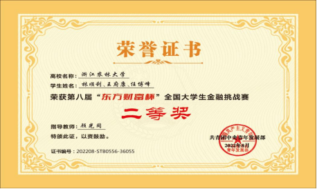 第八届东方财富杯全国大学生金融精英挑战赛全国决赛于2022年4月25日-7月29日举行。我校学子荣获国家级二等奖1项和省级一、二、三等奖19项。其中:金融工程专业2020级林顺利、王府康、任博峰同学荣获国家二等奖。我校还荣获浙江省赛区“优秀组织奖”。