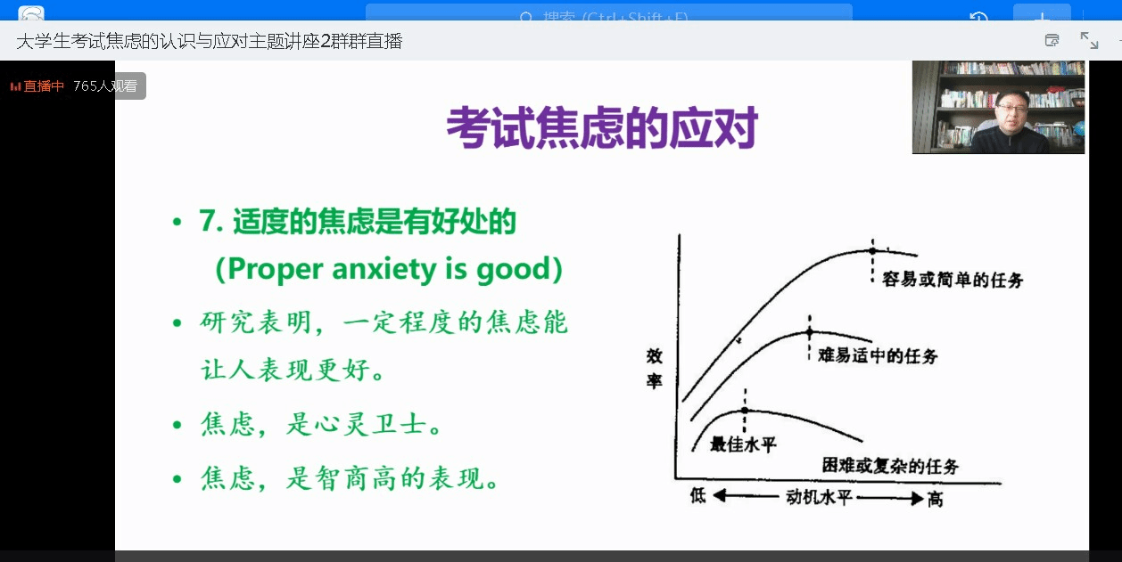 2月19日下午,由学工部心理健康教育中心主办,经济管理学院心理健康辅导站承办的第十期东湖心灵讲堂成功举办,此次活动的主题是《你好,焦虑--大学生考试焦虑的认识与应对》,由南京师范大学原心理中心主任、注册心理督导师曹加平主讲。我校近1000名师生线上观看了直播。