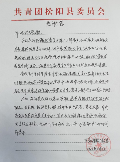 近日,校团委收到了一封来自共青团松阳县委的感谢信。信中,共青团松阳县委对我校经管学院会计学222班程程同学和农林经济管理223班陈秘华同学参加松阳团县委寒假“返家乡”社会实践活动,投身家乡建设表示肯定与赞扬,表达出与我校加强交流合作,更好的服务校地青年的成长成才的意向。
