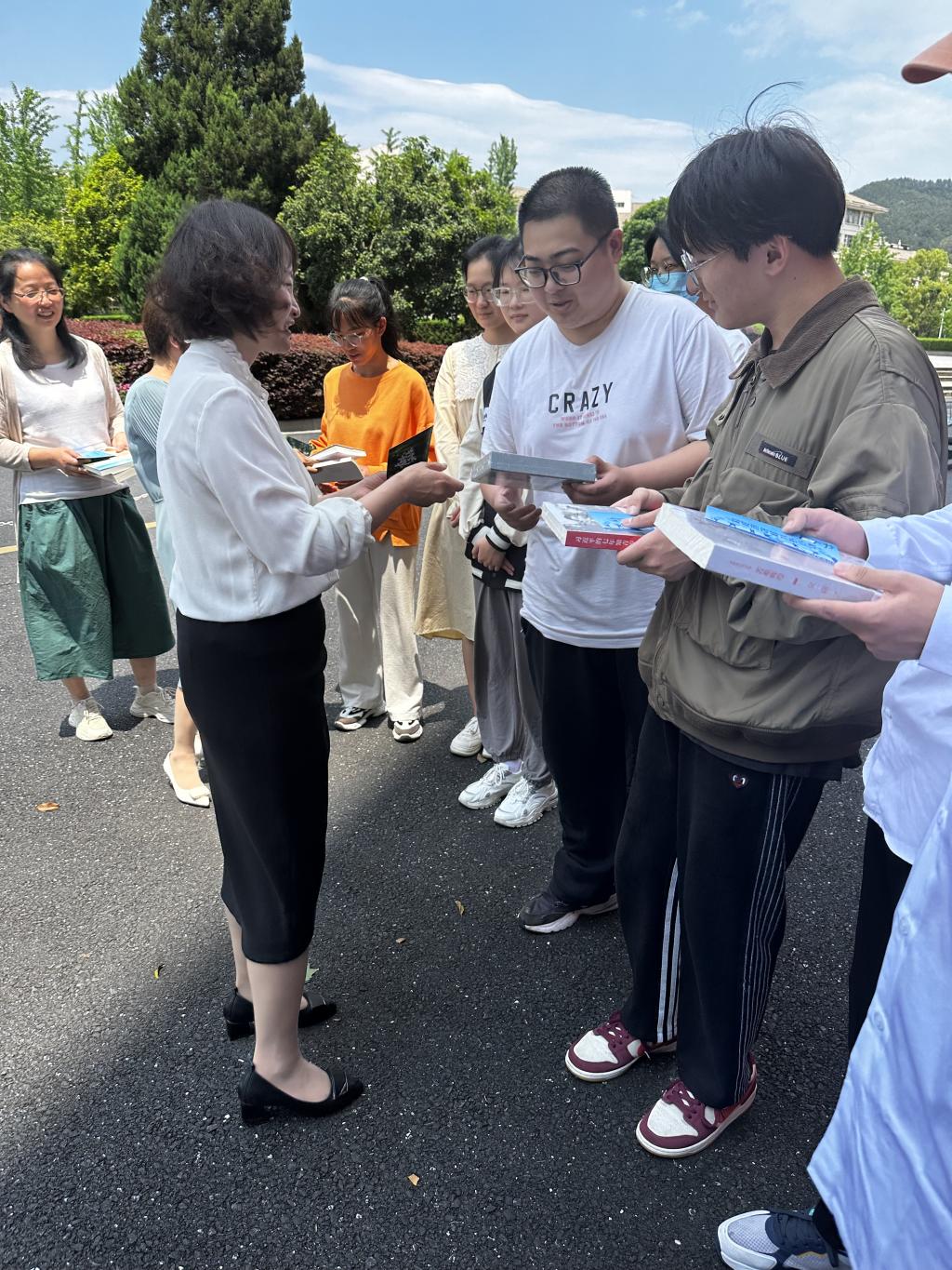 化材学院妇联主席谢志新携妇联执委会委员,给学生代表送上精心挑选的书籍和书签,感谢同学们对学院工作的支持,勉励大家继续发扬敢于担当、无私奉献的精神,争做胸怀理想、脚踏实地的新时代好青年。学院妇联执委会委员们纷纷行动,以多种方式为学生们送去慰问和鼓励。