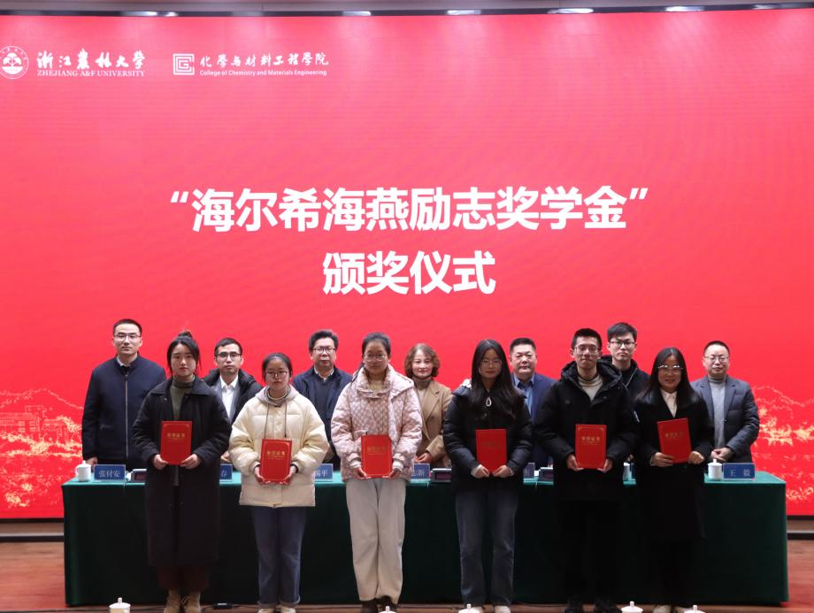 12月28日下午,化材学院举办第一届“海尔希海燕励志奖学金”颁奖典礼。杭州海尔希畜牧科技有限公司董事长楼伟杰、总经办主任兼工会主席王毅、技术研发部经理王力,化材学院党委书记谢志新及学院相关负责人出席活动,应用化学学科教师代表、2022级和2023级120余名学生参加活动。