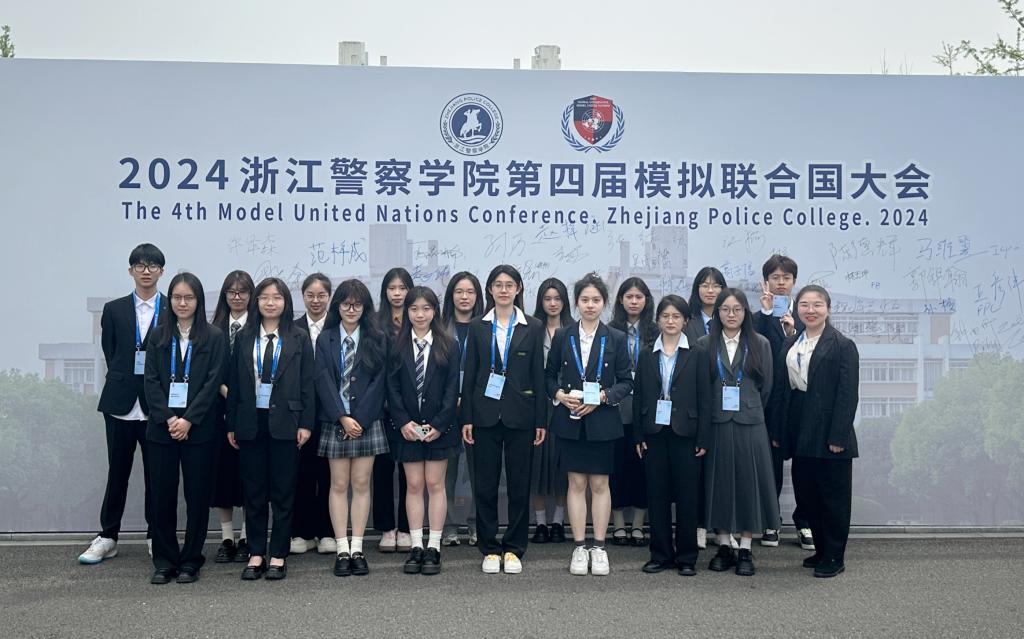 2024年4月12日至14日,校模拟联合国协会指导老师带领我校学生代表团共17名学生,赴浙江警察学院滨江校区参加第四届模拟联合国大会。同学们分别进入联合国粮农组织(FAO)、主新闻中心(MPC)、国际刑警组织、安理会担任代表,完整参加了三天会期。