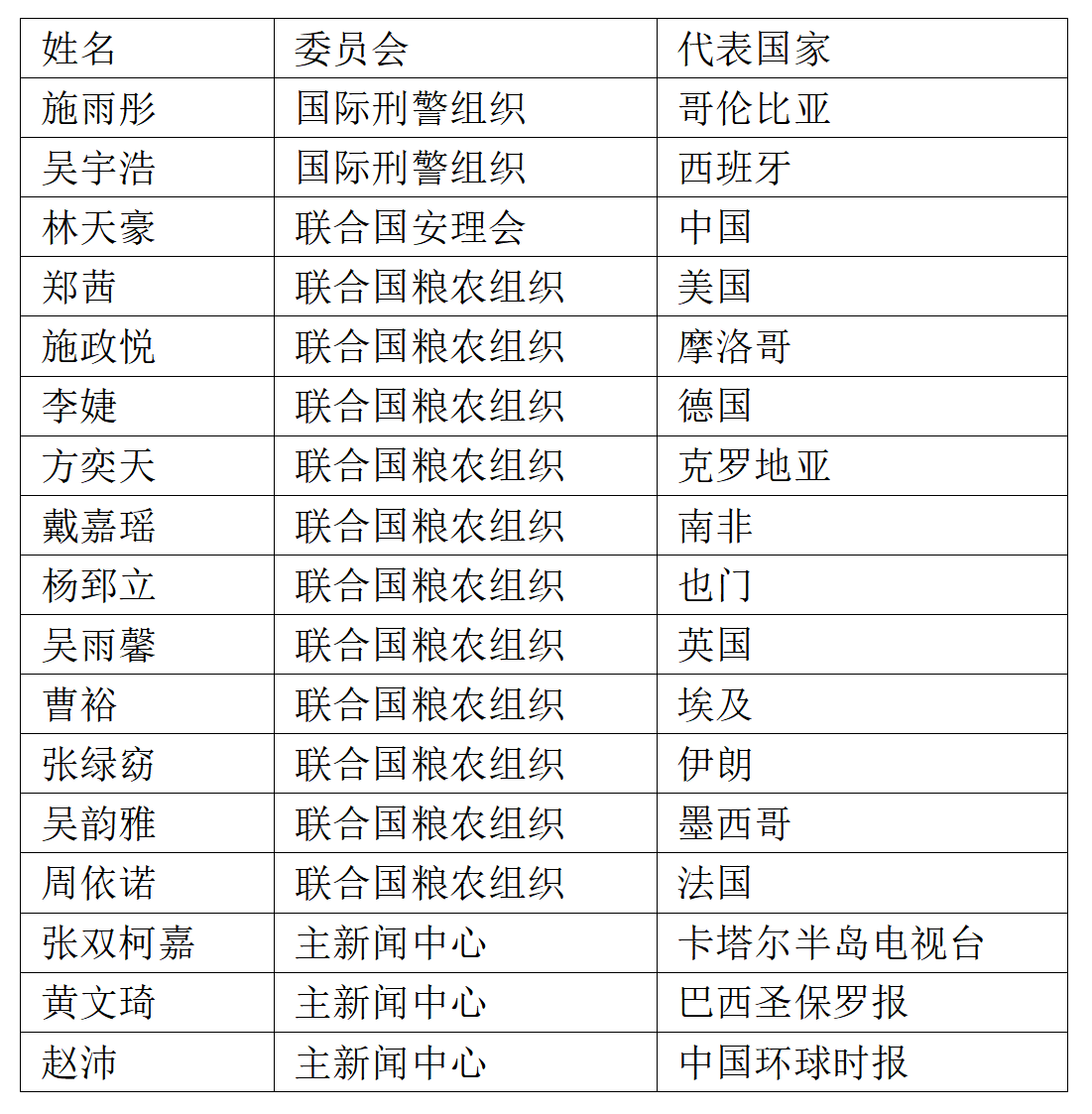 附:学生代表团名单