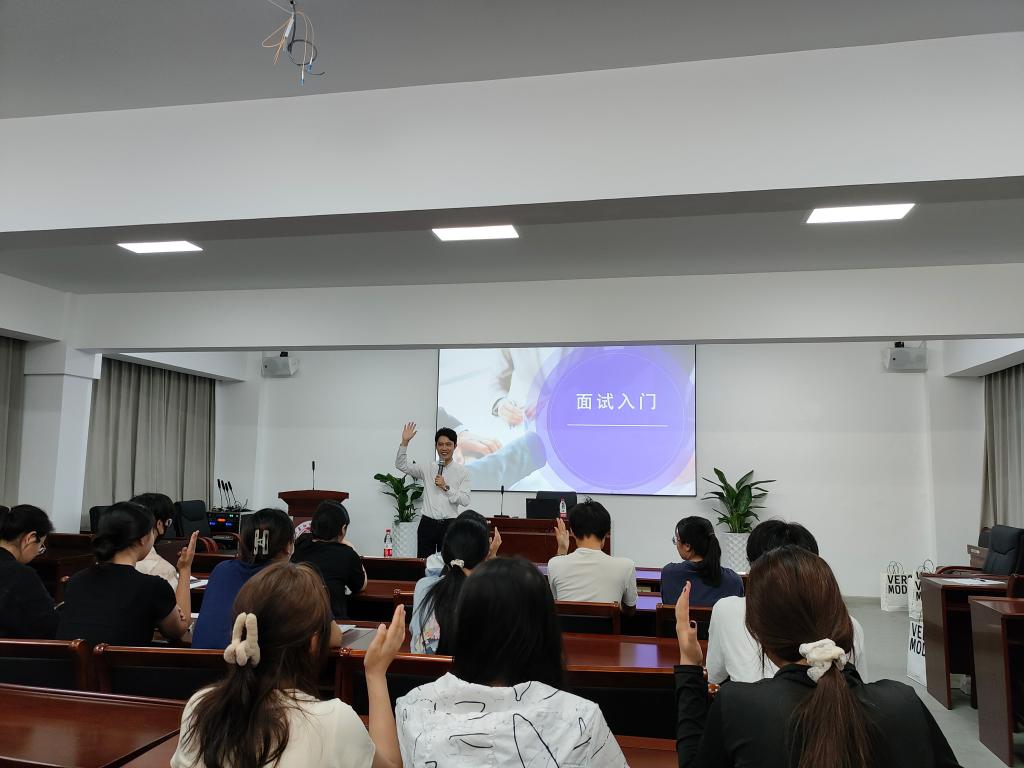 严景城为同学们作求职能力提升培训,他从面试基本问题、面试必备技能、生涯规划等方面进行讲解,并邀请同学们参与互动。同学们在小组讨论和互动分享过程中主动思考、相互完善,将培训内容高效吸收,取得了良好效果。
