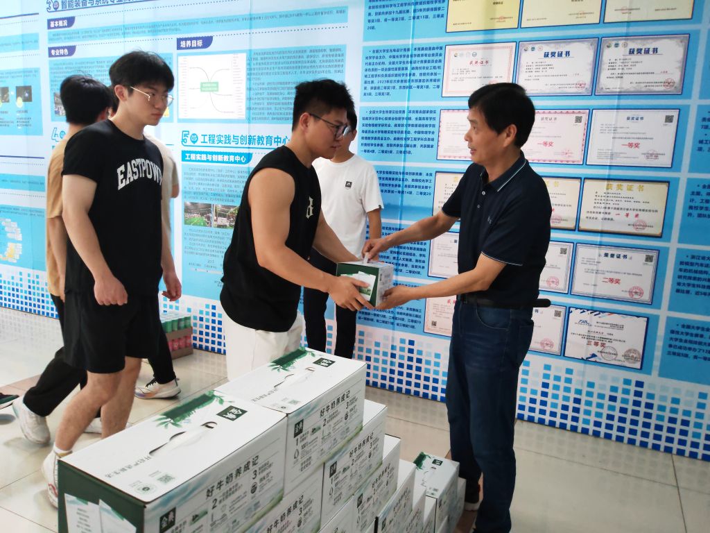 随后院领导们为留校的光机电学子送上慰问品,同学们表示感谢学院的关心关怀,一定会珍惜暑期时间,全力以赴,备考备赛,努力提升自己的专业知识和竞赛水平,为学院争光,为学校添彩。