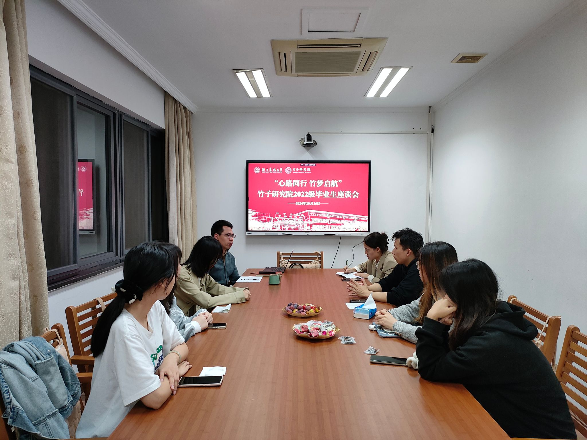近日,竹研院于智能实验楼S217召开“心路同行,竹梦启航”2022级毕业生座谈会。竹研院党总支书记周能寿、辅导员以及各创新团队毕业生参加座谈。