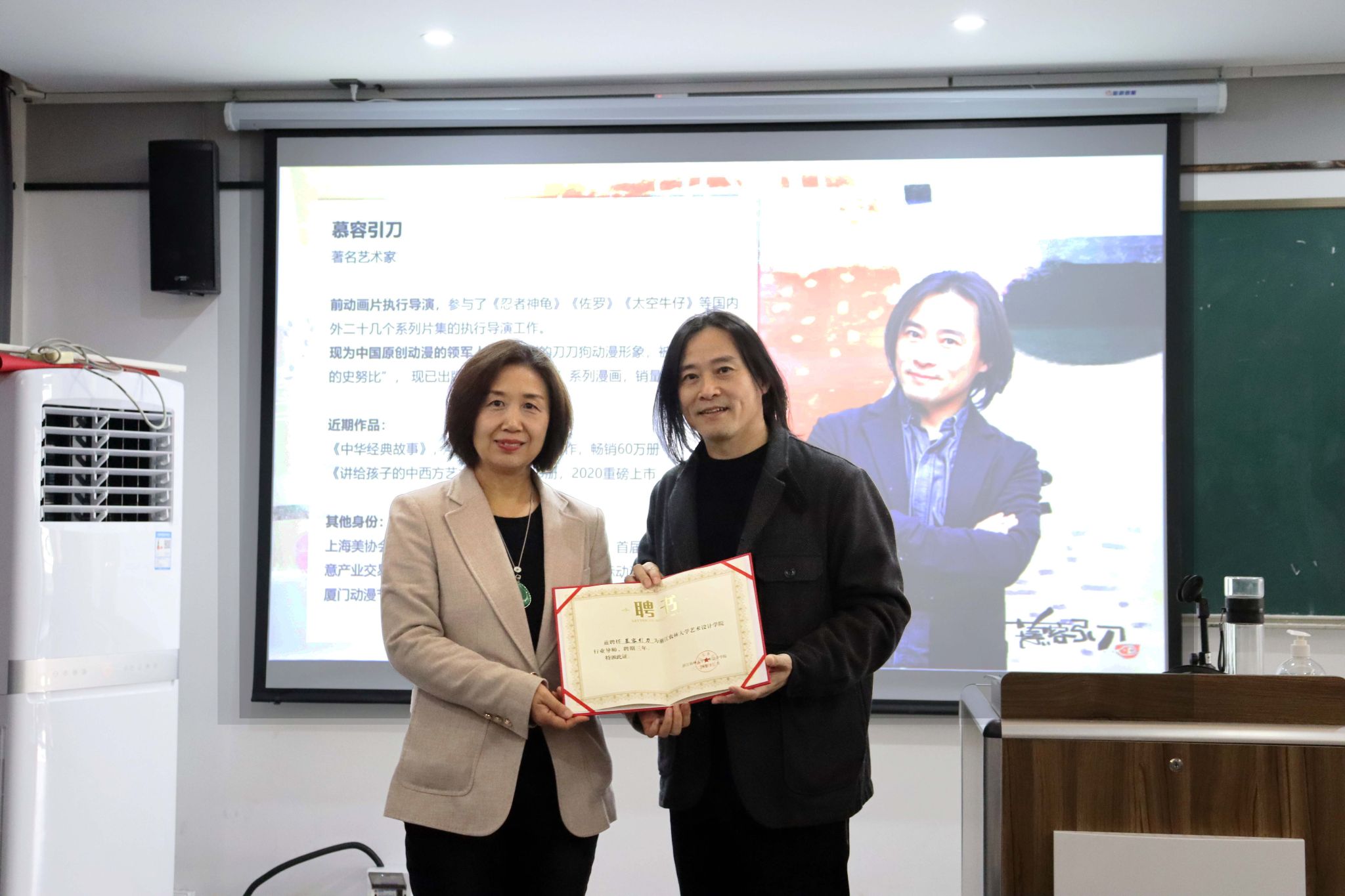 12月20日下午,《热爱点亮艺术》专题讲座在学5展开。此次讲座特邀杭州市文化名家慕容引刀,分享其创作经验与心得,与师生探讨艺术魅力。艺术学院党委书记黄晓芳、分管教学负责人出席,全校80余名师生参加活动。
