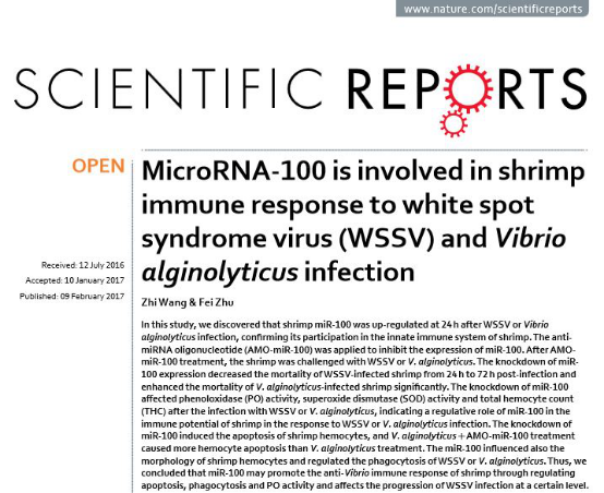 近期,动物科技学院朱斐实验室在国际学术期刊《Frontiers in Immunology》、《Scientific Reports》杂志上分别发表题为“A proteomic study of hemocyte proteins from mud crab (Scylla paramamosain) infected with white spot syndrome virus (WSSV) orVibrio alginolyticus”和“MicroRNA-100 is involved in shrimp immune response to white spot syndrome virus (WSSV) andVibrio alginolyticusinfection”的文章,朱斐副研究员为论文通讯作者,硕士研究生孙保贞、王徵分别为文章的第一作者。