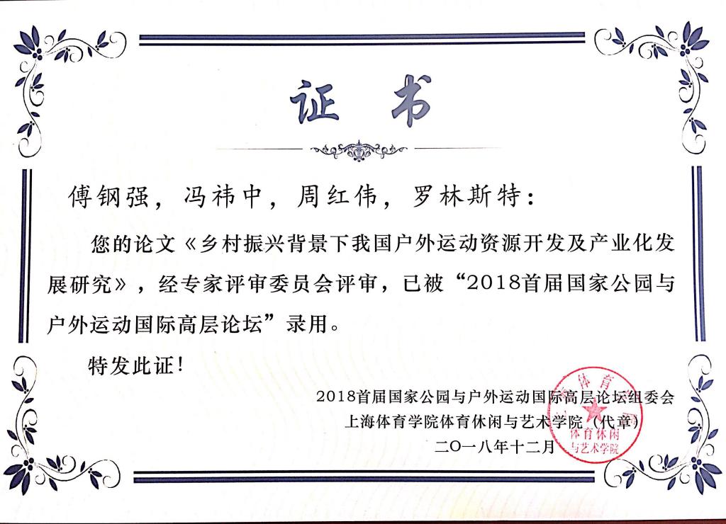 12月12日—15日,“2018首届国家公园与户外运动发展国际高层论坛”在上海体育学院举行。我部傅钢强等四位老师撰写的论文《乡村振兴背景下我国户外运动资源开发及产业化发展研究》被会议录用,并由傅钢强老师作为代表全程参与了论坛。