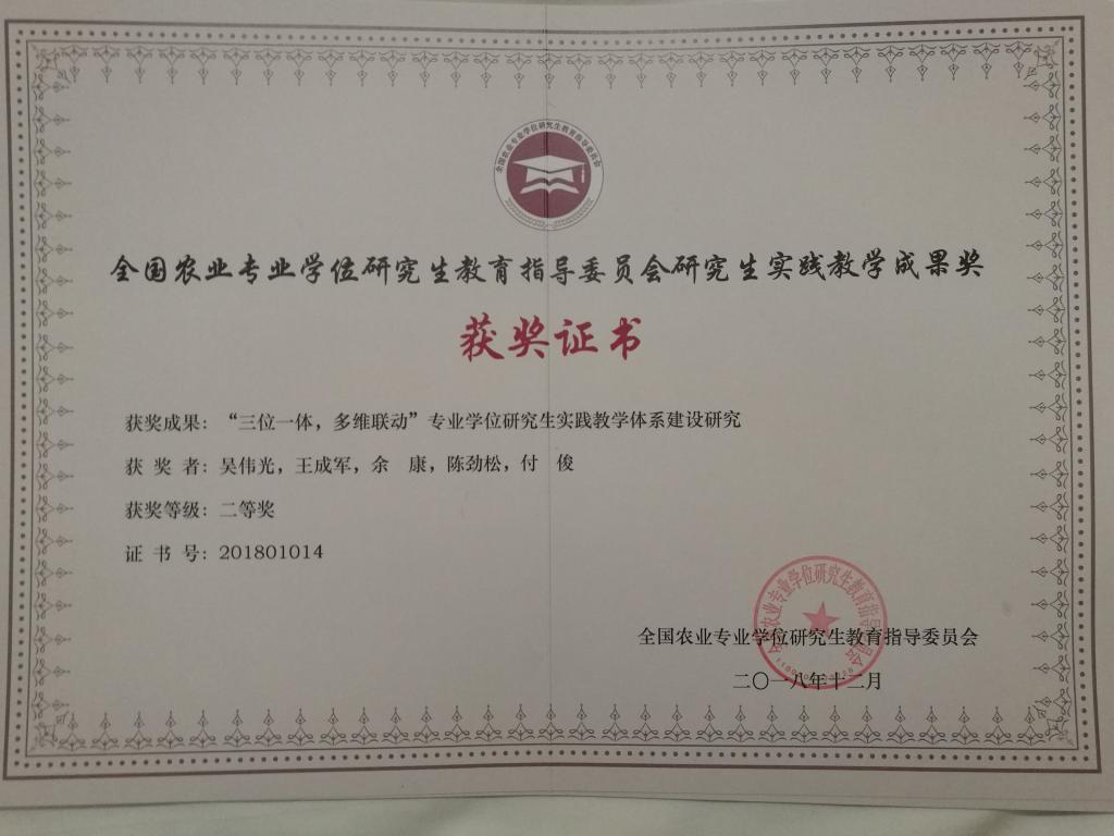 12月24日,在2018 年全国农业专业学位研究生教育研讨会暨科技小院 10 周年纪念会上,经管学院《“三位一体,多维联动”专业学位研究生实践教学体系建设研究》获全国农业硕士专业学位研究生实践教学成果奖。这是我校首次获得全国农业硕士专业学位研究生实践教学成果奖。该成果由吴伟光、王成军、余康、陈劲松、付俊5位教师共同完成。