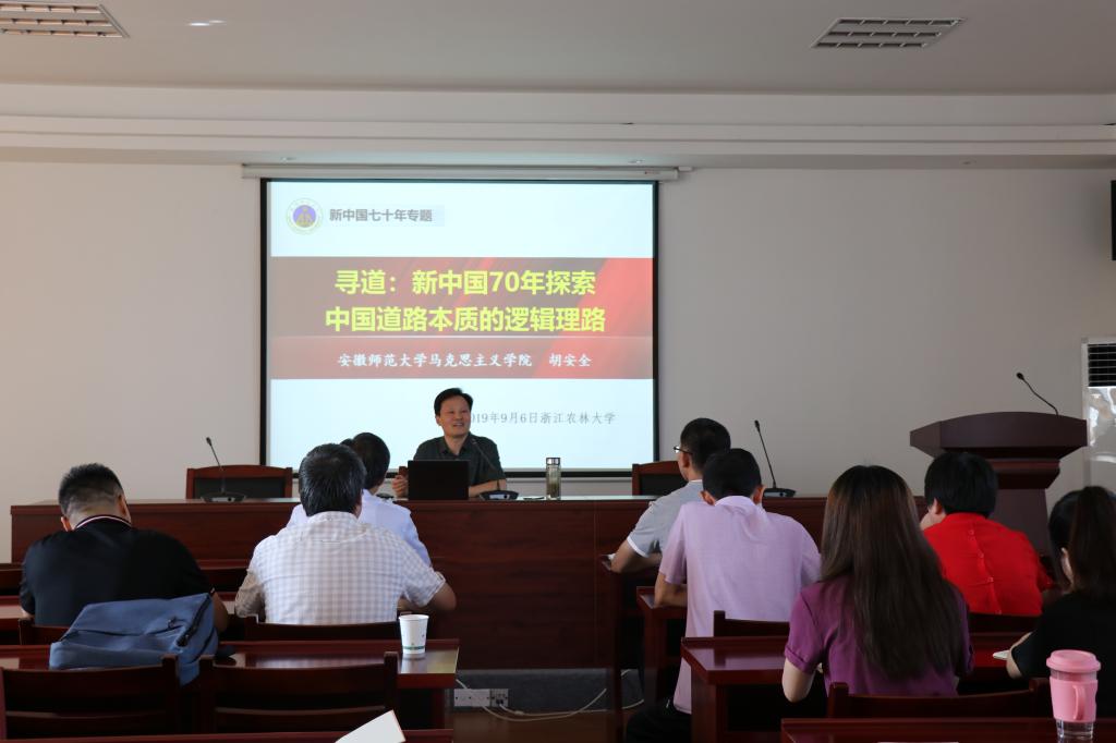 9月6日,安徽师范大学马克思主义学院博士生导师胡安全教授应邀来我校马克思学院作题为“寻道:新中国七十年探索中国道路本质的逻辑理路”的专题学术报告,全院教师及研究生聆听了讲座。