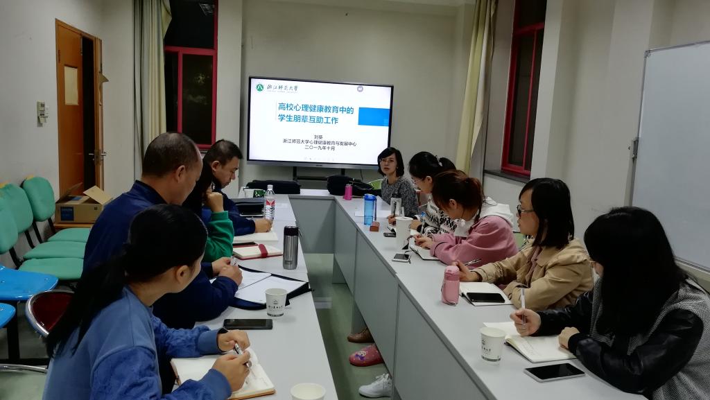 为进一步加强和创新我校心理健康教育工作,提升心理育人与朋辈心理互助的专业性和积极性,完善“学校-学院-班级-宿舍”四级心理心理健康教育工作体系,日前,校心理中心邀请浙江师范大学心理中心副主任刘葵老师来校作“高校心理健康教育中的学生朋辈互助工作”培训。中心专兼职心理教师、各二级心理健康辅导站站长参加此次活动。