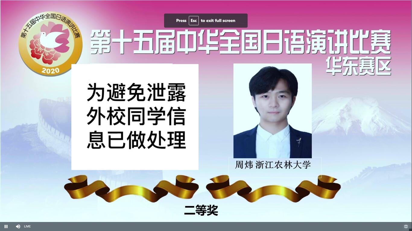 11月8日,“第十五届中华全国日语演讲”华东赛区决赛进行。本次比赛,由中国教育国际交流协会,日本经济新闻社,中日学术交流中心主办。我校文法学院日语专业172班周炜同学在本次比赛中荣获二等奖。