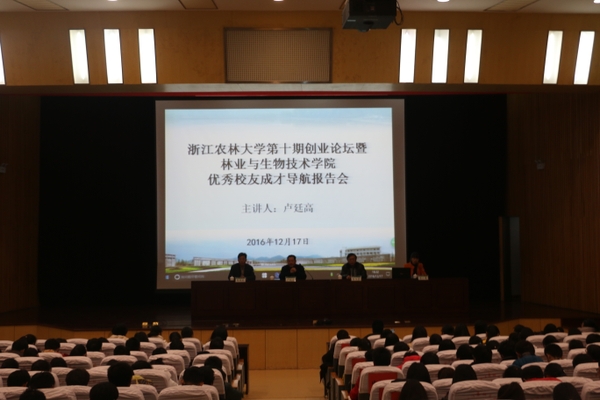 12月17日晚,开云电竞s132016年第十期创业论坛暨林业与生物技术学院优秀校友成才导航报告会在图书馆第一报告厅举行,1996届林学专业校友、浙江绿亚景观建设有限公司董事长卢廷高应邀作主题报告。创业处处长朱永法,林生院相关负责人、创业中心老师和500余名学生参加了论坛。