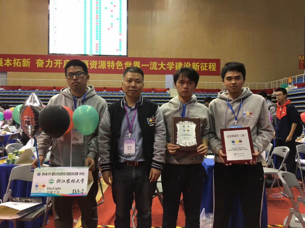 11月2-3日,第44届ACM-ICPC国际大学生程序设计竞赛亚洲区域赛(徐州站)在中国矿业大学举行。经过激烈比拼,我校由信息工程学院童孟军、吴达胜老师带领的“白昼之光”队(队员:黄磊、顾博盛、章朝哲),以队伍排名全国第33名获得银牌,位居全国所有参赛的农林类高校榜首,同时荣获J题的最快解题奖。