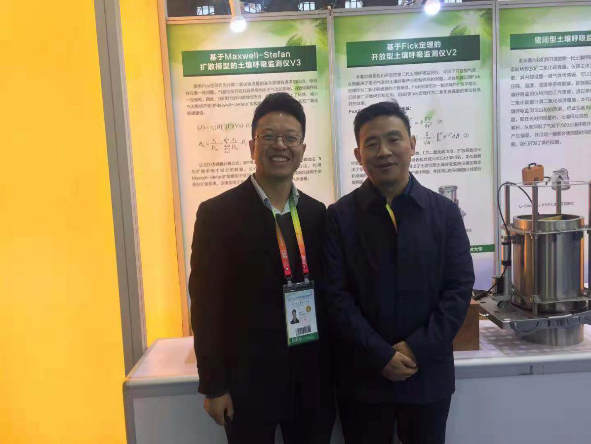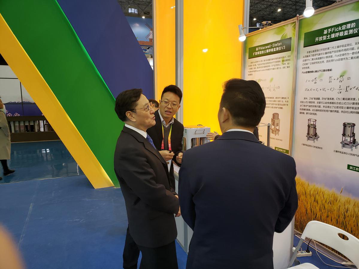 在展会上,科技部副部长张景安等仔细观看土壤呼吸监测仪,听取胡军国教授讲解,对我校科研成果表示赞赏,并提出宝贵的意见和建议。有多家单位及科研人员来展位了解土壤呼吸监测仪的作用、功能、参数和性能指标等,有三家单位与胡军国团队达成了意向协议。