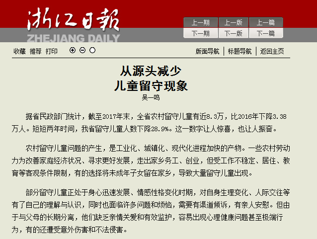 5月29日,《浙江日报》刊登我校“三农”发展智库(浙江省农民发展研究中心)吴一鸣评论文章《从源头减少儿童留守现象》。