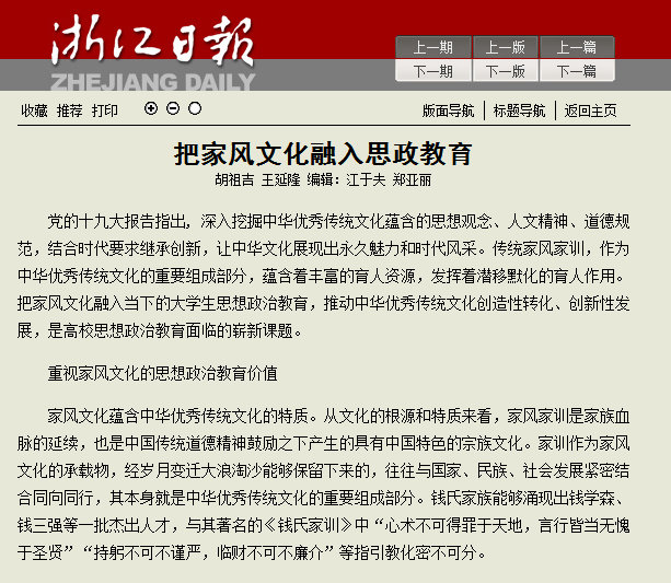 近日,《浙江日报》理论版刊登浙江省中国特色社会主义理论体系研究中心开云电竞s13研究基地教师胡祖吉、王延隆的理论文章《把家风文化融入思政教育》。