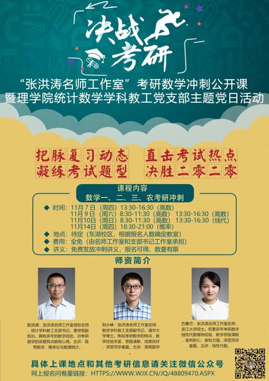为了更好地服务我校考研同学,不忘教书育人初心,张洪涛名师工作室特倾力打造2020考研数学冲刺公开课程。课程将历时3天:11月7日(周四)下午、11月9、10日(周六、周日)全天、11月14日(周四)晚上(详情见海报),由理学院教师张洪涛、刘小林、方惠兰共同授课。