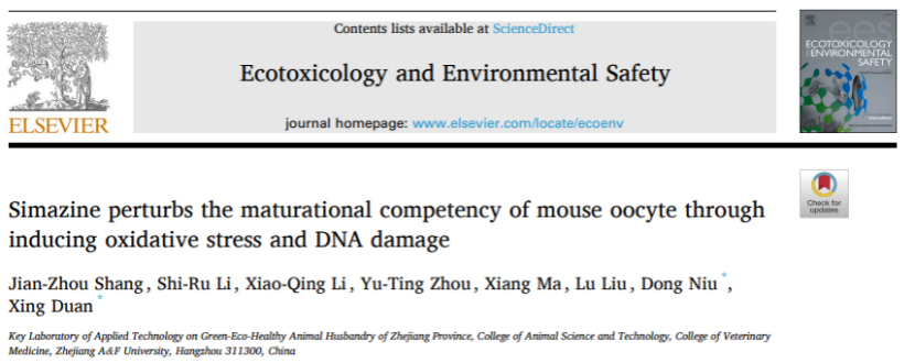 1月15日,段星教授团队指导动物科学2018级本科生尚建洲在国际知名期刊Ecotoxicology and Environmental Safety(中科院二区Top,IF: 7.129)发表题为“Simazine perturbs the maturational competency of mouse oocyte through inducing oxidative stress and DNA damage”的研究论文。