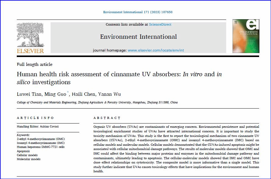 近日,化学与材料学院硕士研究生田路伟同学在国际知名期刊Environment International(中科院一区,IF: 13.352)发表了题为“Human health risk assessment of cinnamate UV absorbers:in vitroandin silicoinvestigations”的研究论文。论文通过研究Cinnamate类紫外吸收剂对人体细胞影响机制的研究,对Cinnamate类紫外吸收剂对生态环境的危害及康养效应的有害影响进行评析。