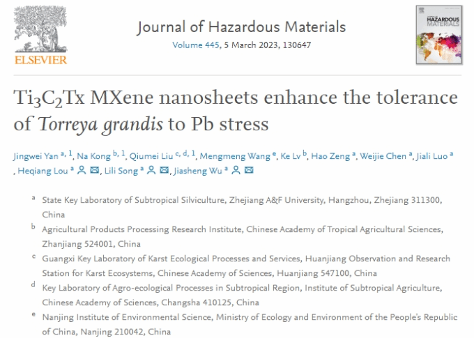近日,国家重点实验室特色干果团队(吴家胜教授团队)在国际TOP期刊《Journal of Hazardous Materials》(IF=14.224)发表了题为“Ti3C2Tx MXenenanosheets enhance the tolerance ofTorreyagrandisto Pb stress”的研究论文,较为系统地阐明了新型二维材料MXene缓解香榧“铅毒”的作用机制。研究结果不仅为环境纳米材料在植物根细胞中固定铅离子的作用机制提供了理论依据,同时对于扩展MXene应用领域具有重要意义。