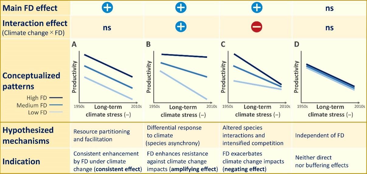 基于此,陈信力教授与多位国际学者合作,通过分析2491个森林样地超过57年的数据,探讨了树木功能多样性和功能性状对森林生产力在面对环境变化时的影响。研究发现,尽管干旱地区森林生产力因水分下降的压力而普遍下降,具有较高功能多样性的森林却能维持相对较高的生产力水平,而功能多样性较低的森林生产力下降更显著。此外,具有资源获取型特征的森林可以从气候变暖中受益,而具有耐旱特征的森林对干旱表现出更好的抵抗能力。该研究表明,促进森林的功能多样性可以增强其对气候变化的适应能力和韧性。通过了解树木物种的功能性状,森林管理策略可以优先选择能够耐受或从变化的环境条件中受益的物种,这对于促进森林生态系统应付气候变化的长期可持续性至关重要。