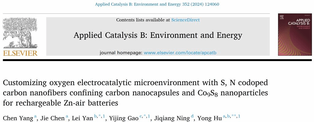 近日,化材学院胡勇教授与颜磊博士等人在国际顶级期刊《Applied Catalysis B: Environment and Energy》(中科院1区TOP,IF=22.1)发表题为《调控基于碳胶囊与Co9S8纳米颗粒组成的S,N共掺杂碳纤维氧电催化剂的界面微环境用于高效锌空电池》“Customizing oxygen electrocatalytic microenvironment with S, N codoped carbon nanofibers confining carbon nanocapsules and Co9S8nanoparticles for rechargeable Zn-air batteries”的研究论文。