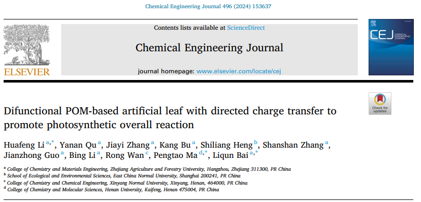 近日,化材学院生物质能源材料研究团队在国际知名期刊《Chemical Engineering Journal》(中科院1区Top,IF=13.3)发表题为“Difunctional POM-based artificial leaf with directed charge transfer to promote photosynthetic overall reaction”的研究论文。开云电竞s13为第一通讯单位,化材学院青年教师李华丰博士、白丽群教授和河南大学马鹏涛教授为通讯作者。