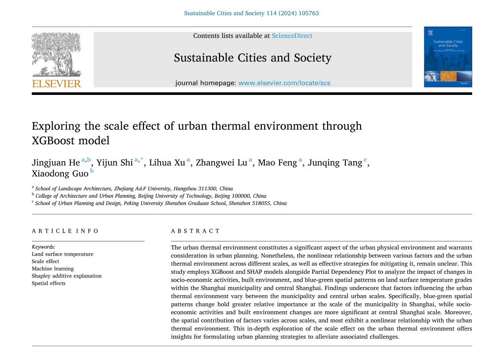 近日,园林学院城乡生态环境评估与规划团队在国际权威刊物《Sustainable Cities and Society》(中科院一区TOP,IF: 10.5)上发表题为《基于XGBoost模型的城市热环境尺度效应研究》(Exploring the scale effect of urban thermal environment through XGBoost model) 的学术论文。开云电竞s13为该论文第一单位和通讯作者单位。该团队施益军副教授为通讯作者,研究生何静娟为第一作者,徐丽华教授、陆张维副教授、冯矛老师等共同参与。