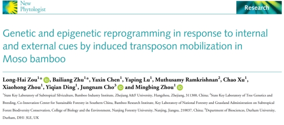 近日,竹子研究院分子育种与笋用林培育团队在国际植物科学领域权威期刊《New Phytologist》(中科院一区Top,IF-5yr=10.2)在线发表了题为《毛竹转座子跳跃引起响应外部和内部信号的遗传和表观遗传重编程》(Genetic and epigenetic reprogramming in response to internal and external cues by induced transposon mobilization in Moso bamboo)的研究论文,解析了LTR逆转座子响应内外信号发生转座进而调控发育和逆境响应基因表达的分子机制。
