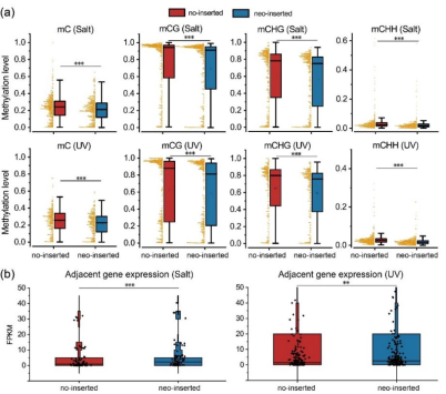 在该研究中,研究组从遭受多种非生物胁迫和不同发育阶段的毛竹组织中,鉴定出大量被激活的LTR逆转座子。这些转座子激活与位点特异性去甲基化相关,并且它们主要分布在蛋白质编码基因附近。有趣的是,这些转座子激活与邻近基因的表达呈正相关,而这些邻近基因主要是胁迫应激反应和发育的相关因子。进一步研究发现,响应胁迫和发育信号而发生的LTR逆转座子新转座事件,也倾向于插入近蛋白编码基因。这些新插入位点的去甲基化延伸到插入位点两端,导致近端位点甲基化水平降低,促进附近编码基因表达。最后,研究组通过转座印迹跟踪和转基因试验,证实了LTR逆转录转座子新插入位点的偏好性及其对应激和发育适应的影响。该研究揭示了LTR逆转录转座子在逆境和发育中被激活,通过偏好性的转座和改变DNA甲基化水平,进而改变相关基因的表达,参与抗逆和发育。