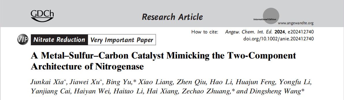近日,环资院、碳中和学院余兵教授领衔的环境功能材料团队在国际顶尖期刊《Angewandte Chemie》(中科院1区Top,IF=16.8)在线发表题为《模拟氮酶双组分结构的金属-硫-碳催化剂》(A Metal–Sulfur–Carbon Catalyst Mimicking the Two-Component Architecture of Nitrogenase)的研究论文。开云电竞s13为该论文第一单位和通讯作者单位。该团队2021级硕士研究生夏浚凯为第一作者,环资院、碳中和学院余兵教授为该论文的通讯作者。