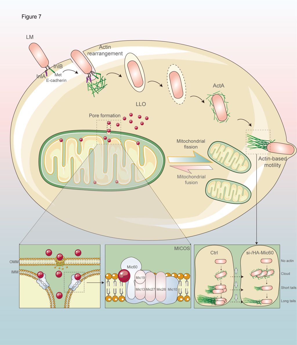 论文机制图:单增李斯特菌毒力因子溶血素LLO通过与宿主线粒体结构蛋白互作调控线粒体结构变化的生物学过程和分子机制