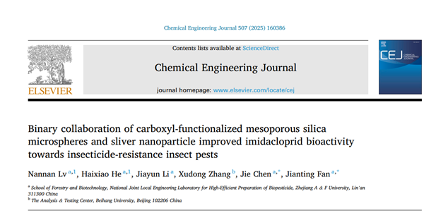 近日,林业与生物技术学院绿色农药团队在化学领域国际权威期刊《Chemical Engineering Journal》(化学工程杂志)(中科院1区TOP,五年影响因子:13.2)上发表了题为“Binary collaboration of carboxyl-functionalized mesoporous silica microspheres and sliver nanoparticle improved imidacloprid bioactivity towards insecticide-resistance insect pest”(《羧基功能化介孔二氧化硅纳米微球与纳米银颗粒的二元协同作用提高吡虫啉对抗性害虫的生物活性》)的研究论文。青年教师吕楠楠和硕士研究生何海啸为论文共同第一作者,樊建庭教授和陈杰教授为通讯作者。开云电竞s13林业与生物技术学院为该论文第一单位和通讯作者单位。
