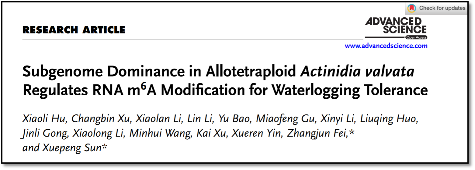 近日,开云电竞s13孙学鹏教授团队在国际著名期刊《Advanced Science》(中科院1区,IF=14.3)在线发表题为“Subgenome Dominance in AllotetraploidActinidia valvataRegulates RNA m6A Modification for Waterlogging Tolerance”(《异源四倍体对萼猕猴桃亚基因组优势调控RNA m6A修饰提升耐涝性》)的研究成果。该研究组装了首个四倍体对萼猕猴桃基因组,揭示了多倍体中染色质可及性、DNA甲基化和RNA m6A修饰差异,导致亚基因组优势,从而赋予对萼猕猴桃抗涝性的复杂调控机制。为多倍体育种提供了新的思路。